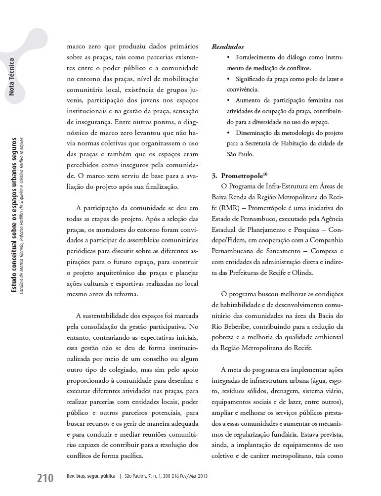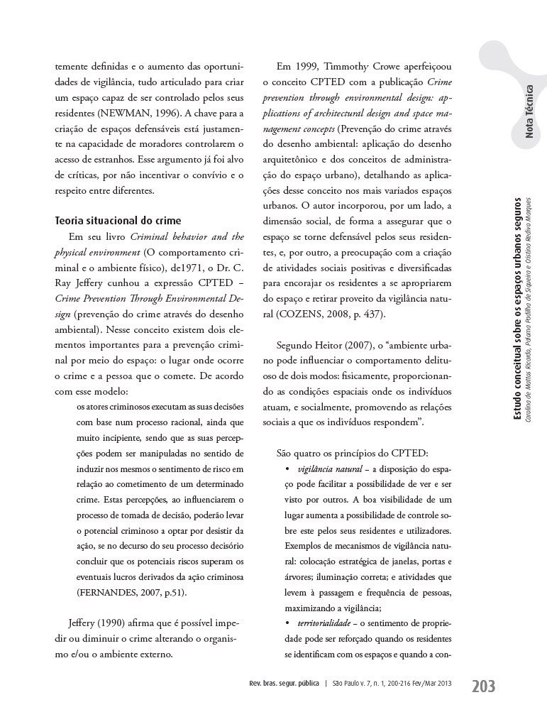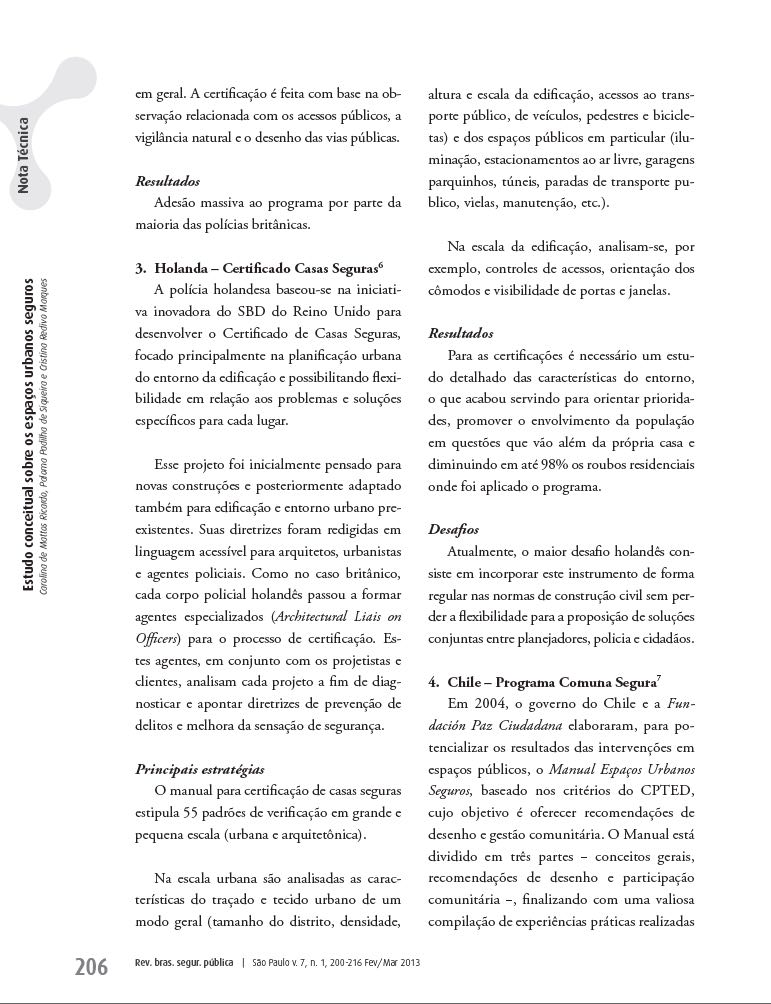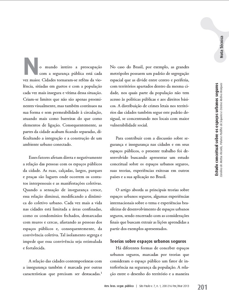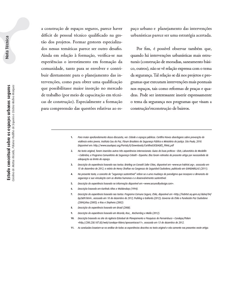 This text aims to present an overview of the issue so as to map out the conceptual state-of-the-art and track the implementation of safe urban space projects domestically and internationally. The text is therefore divided into: a general presentation of the topic; a mapping of the main series of safe urban spaces; a description of international and domestic experience with the introduction of safe spaces; and final remarks that analyze the major lessons learned from the experiences presented. It was drafted for the Brazilian Public Safety Forum on behalf of the Ministry of Justice’s National Public Safety Secretariat, within the scope of the Partnership Agreement 752962/2010.