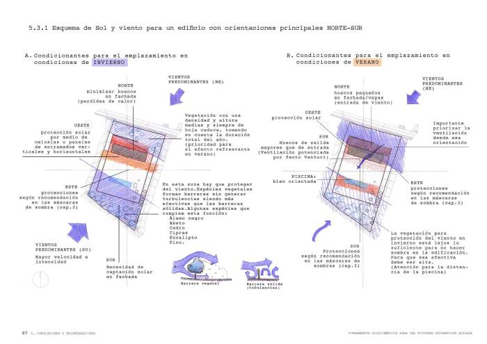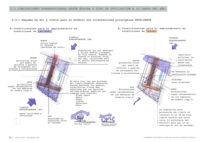El amplio margen de condiciones térmicas requiere el aprovechamiento de la radiación, del efecto de los vientos y de la protección contra ellos. Así, la edificación deberá ejercer un doble papel.