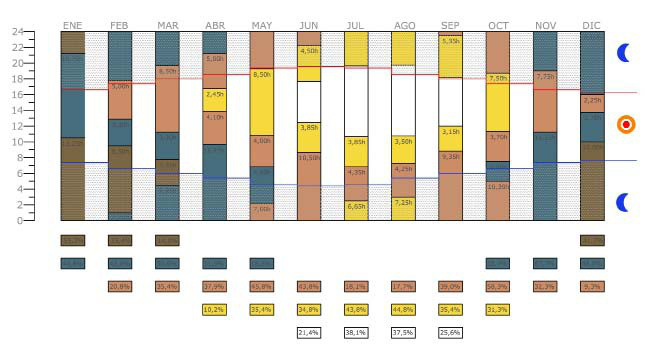 – 2.120 h (28,07 %) se podrían abastecer por medio de sistemas solares activos, si las condiciones lo permiten.