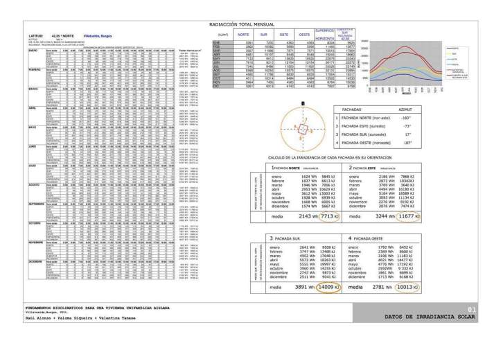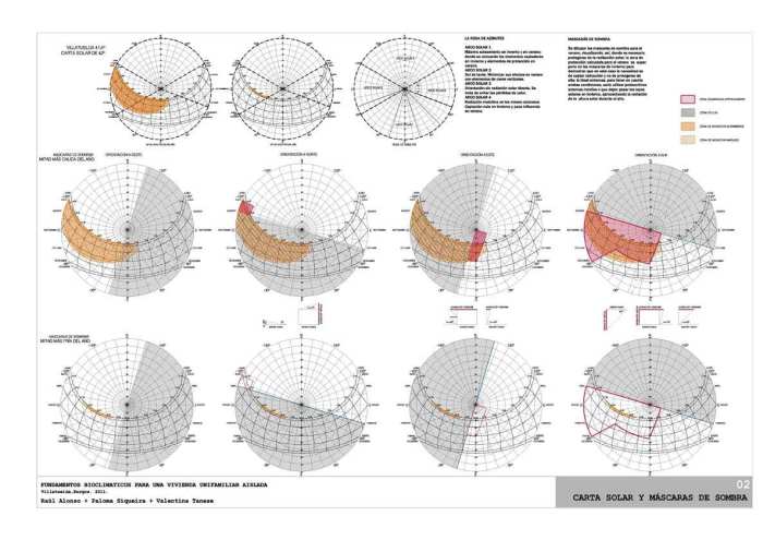 La orientación Sur con una ligera tendencia al este (15º) asegura una la distribución calorífica equilibrada. En este caso la situación y geometría del solar provoca la tendencia de colocar las orientaciones N, S, E y O con un giro de 17º en el sentido de las agujas del reloj. Esto hace que la orientación Sur tenga una pequeña componente Oeste, sin llegar a ser suficiente para ser tenida en cuenta como diferente a la orientación sur en términos generales. La orientación de los edificios debe estar en relación con la exposición a los vientos.