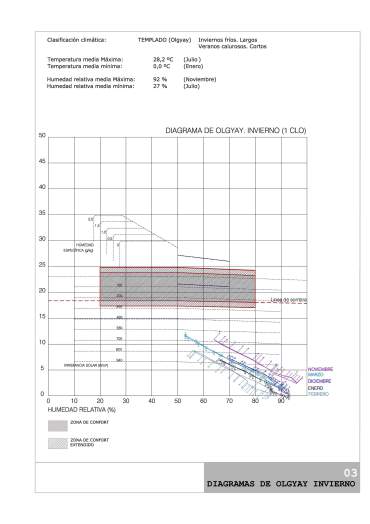 La capacidad de aislamiento frente a las bajas temperaturas deberá diseñarse en función del gradiente térmico máximo invernal de 18,9 ºC -Marzo-. El aislamiento requerido en relación a la orientación Sur es: E y O, 1,3; N, 1,4; Cubierta, 1,5. Para poder equilibrar la distribución calorífica interna, el material del muro Oeste debe tener un retardo de por inercia de en torno a 6 horas. Una barrera de vapor situada en el lado cálido previene la condensación.