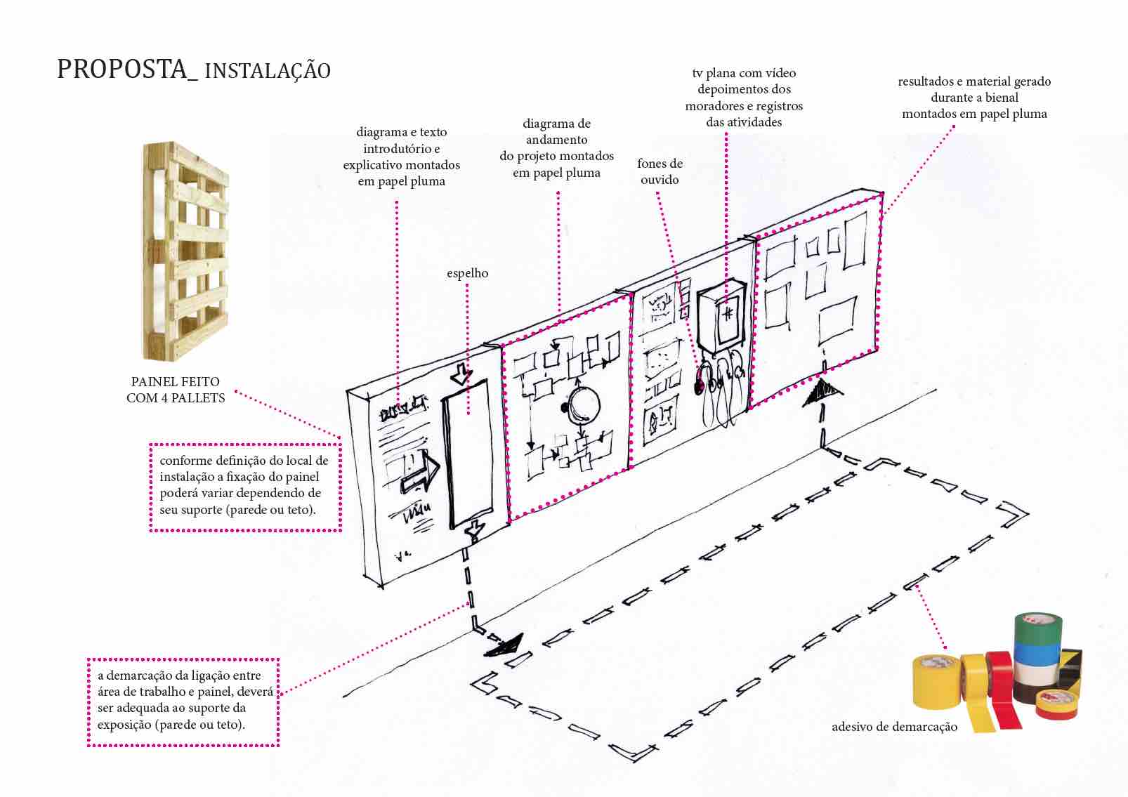 o projeto proposto e o processo de ativação da cidadania pop-up, contendo imagens e textos conforme necessário, uma tela para exibição em vídeo das atividades realizadas durante a Bienal e um espaço livre que será preenchido no decorrer do processo.