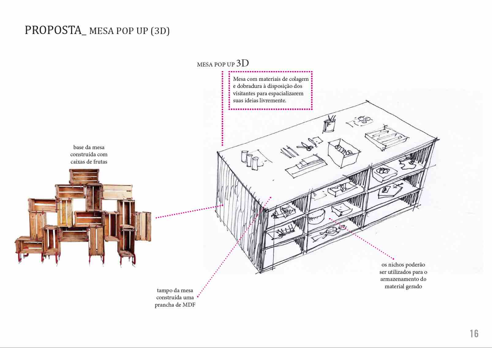 • Uma área de trabalho para a participação dos visitantes, formada por uma mesa com imagens impressas, um rolo de papel manteiga ou vegetal sobre elas e lápis de cor, e outra mesa com diferentes materiais, como tesoura, cola, papéis de formas, cores e tamanhos diferentes para os participantes brincarem com propostas pop-up. Esta mesa terá espaço para acumular e expor o material gerado entre cada atividade externa.