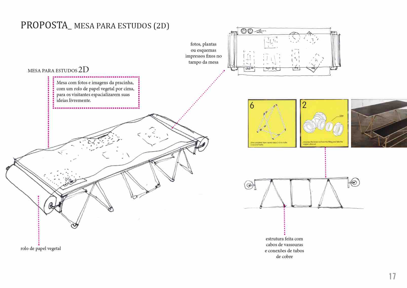 A proposta consiste em um desafio, em forma de jogo, onde juntos teremos que projetar e construir a Pracinha durante os 40 dias de duração da Bienal. Com isso pretendemos conseguir credibilidade junto a mais moradores do bairro e potenciais apoiadores públicos