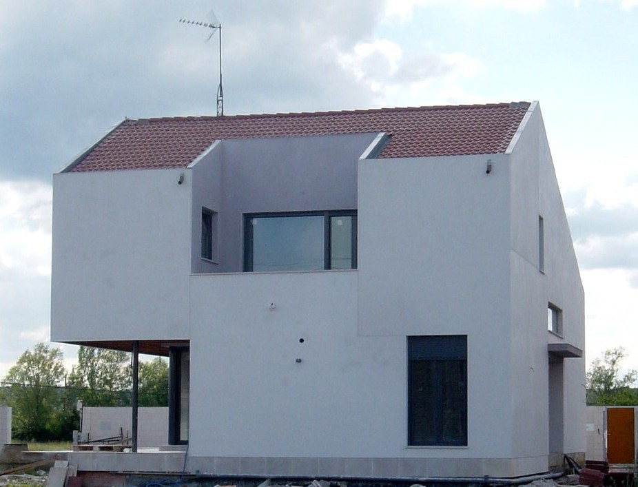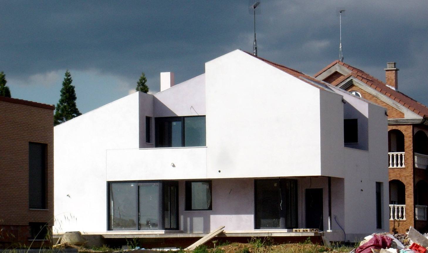 Vivienda unifamiliar en parcela de 600 m2. Con acceso desde el este. Se orienta dando la espalda al norte, dejando para esa zona solamente los accesos. La zona del estudio, situada también en la zona norte, abre sus huecos al este, para poder calentarse por la mañana y facilitar el trabajo. Hacia el sur se abren dos de las piezas básicas de vida de la casa, el salón-comedor y la cocina, protegidos mediante un porche calculado para proteger de los rayos solares en verano y permitir su entrada en invierno, sin pilares que molesten las vistas y orientado a sur-este para aumentar la sensación de amplitud y ocultarse de las miradas de los viandantes de la calle. En planta primera se sitúan dos habitaciones con sendos vestidores, baños, y terrazas, retranqueadas con respecto a la fachada para dar privacidad y protección.