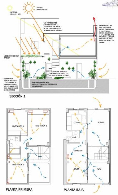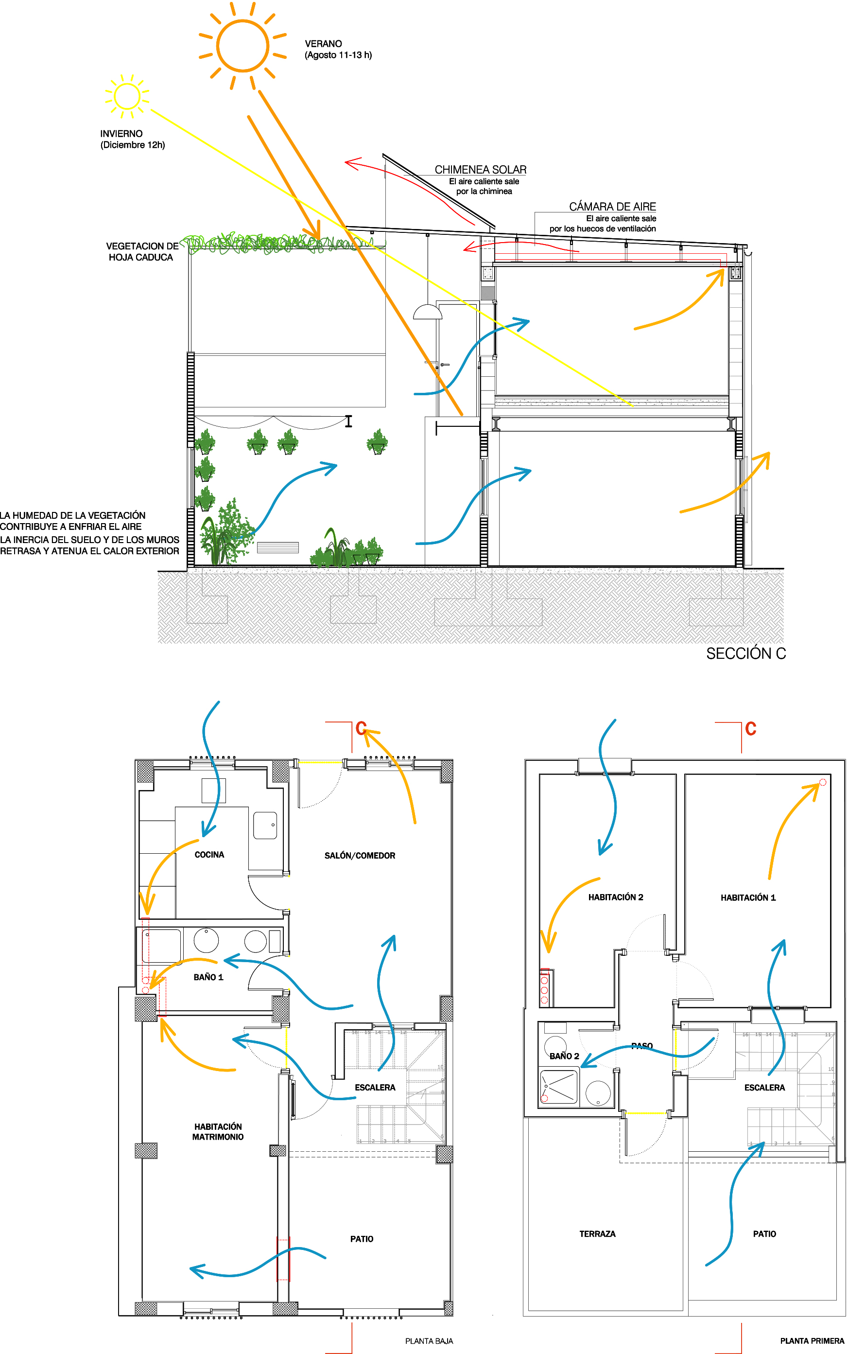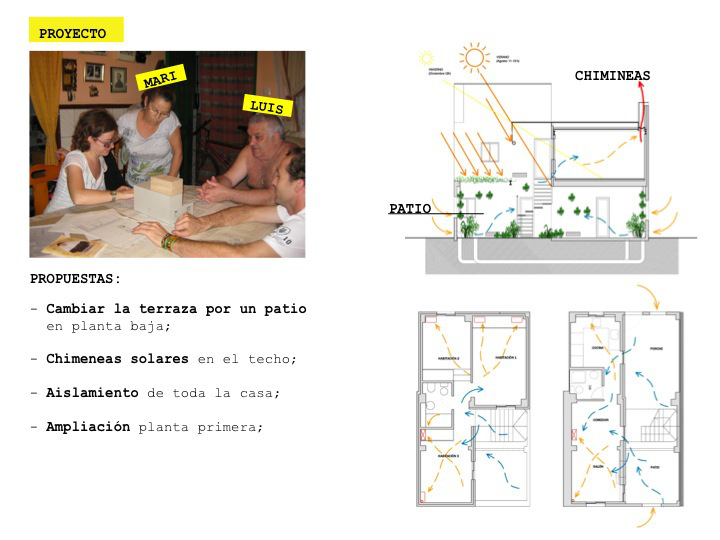 En la actualidad, la parte más importante de la casa es probablemente la terraza de la primera planta, el lugar preferido de Luis, donde cuida de sus plantas y pinta sus macetas del color de su Betis. Aunque está protegida por telas de invernadero, es un espacio muy caluroso y poco ventilado,  así que les propusimos cambiar esa terraza por  un patio en planta baja, sombreado, en contacto con la inercia del terreno y aprovechando la vegetación proporcionada por las plantas de Luis, que funcione como un umbráculo, creando una bolsa de aire fresco que se pueda distribuir por toda la casa con la ayuda del tiro generado por la chimenea solar situada en el techo.